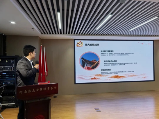 2025年10月25日,河南君志合律师事务所党支部召开了党的二十届四中全会精神专题学习会,本次会议由党支部组织委员李龙飞律师领学,全体律师参会。本次学习既全面覆盖全会核心内容,又紧密结合律师行业职能,推动精神学习走深走实。