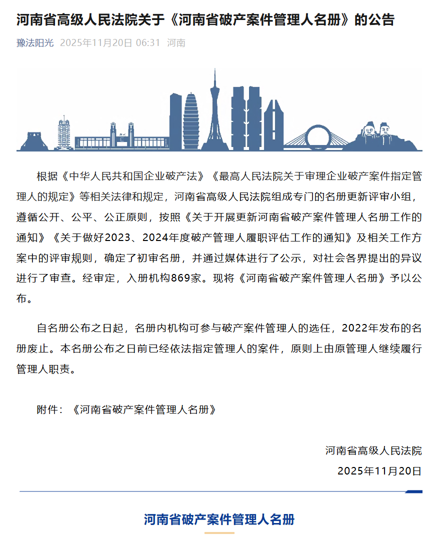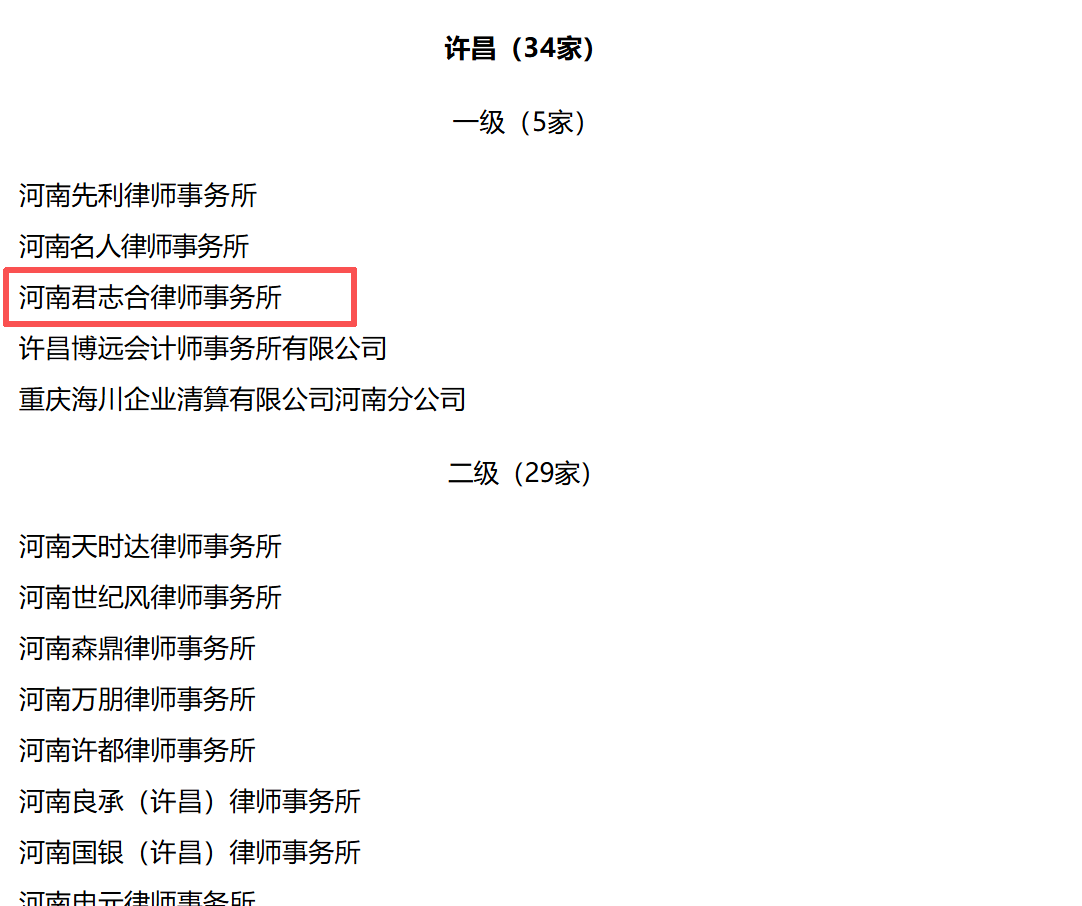 2025年11月20日,河南省高级人民法院发布《河南省破产案件管理人名册》,河南君志合律师事务所再次成功入选河南省破产案件一级管理人。